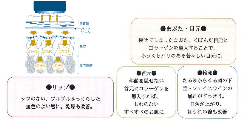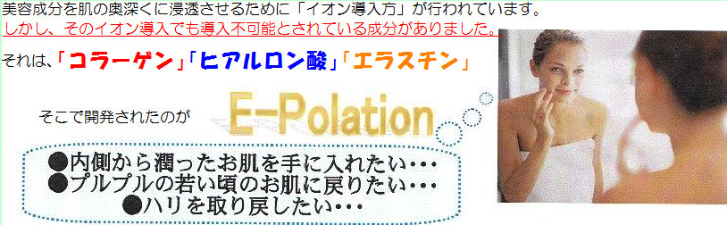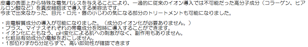 当店では、業務で使用するイーポレーション・プロフェッショナルを導入しており、従来では美容外科にて注射等で、美容液の有効成分を皮膚の深部まで浸透させておりましたレベルの、美容法を実現することができました。 | |||||||||||||||||||||||||