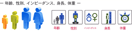 年齢と性別を補正することにより身体をインピーダンスとして置き換えることができ、老若男女の特徴が詳細に反映した正確な体成分分析が可能になります。